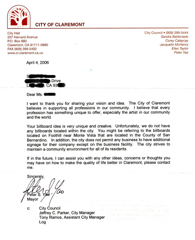 Cc: Mayor Peter S. Yao, P.O Box 880, Clarement,