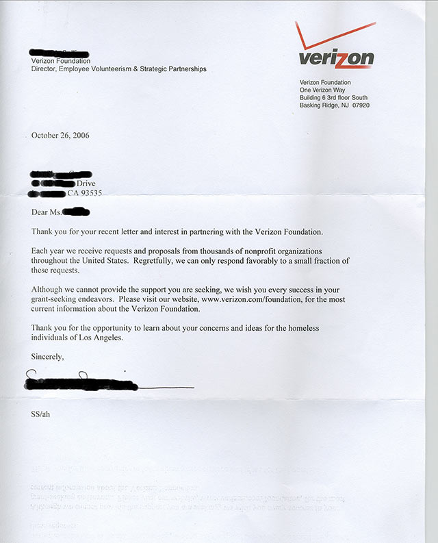 The words brought here are quoted from the Verizon Communication’s website. I hope that the company will be glad to stretch their philanthropic idea to also include the homeless people of Los Angeles. With our help the homeless persons will be able to once again network with the world in order to get a job and a permanent residency, and to gain self-respect and hope.